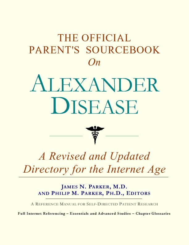 Since the late 1990s, physicians have seen a general increase in parent Internet usage rates. Parents frequently enter their children’s doctor’s offices with printed Web pages of home remedies in the guise of latest medical research. This scenario is so common that doctors often spend more time dispelling misleading information than guiding children through sound therapies. The Official Parent’s Sourcebook on Alexander Disease has been created for parents who have decided to make education and research an integral part of the treatment process. The pages that follow will tell you where and how to look for information covering virtually all topics related to Alexander disease, from the essentials to the most advanced areas of research. The title of this book includes the word “official.” This reflects the fact that the sourcebook draws from public, academic, government, and peer-reviewed research. Selected readings from various agencies are reproduced to give you some of the latest official information available to date on Alexander disease. Given parents’ increasing sophistication in using the Internet, abundant references to reliable Internet-based resources are provided throughout this sourcebook. Where possible, guidance is provided on how to obtain free-of-charge, primary research results as well as more detailed information via the Internet. E-book and electronic versions of this sourcebook are fully interactive with each of the Internet sites mentioned (clicking on a hyperlink automatically opens your browser to the site indicated). Hard copy users of this sourcebook can type cited Web addresses directly into their browsers to obtain access to the corresponding sites. Since we are working with ICON Health Publications, hard copy Sourcebooks are frequently updated and printed on demand to ensure that the information provided is current. In addition to extensive references accessible via the Internet, every chapter presents a “Vocabulary Builder.” Many health guides offer glossaries of technical or uncommon terms in an appendix. In editing this sourcebook, we have decided to place a smaller glossary within each chapter that covers terms used in that chapter. Given the technical nature of some chapters, you may need to revisit many sections. Building one’s vocabulary of medical terms in such a gradual manner has been shown to improve the learning process. We must emphasize that no sourcebook on Alexander disease should affirm that a specific diagnostic procedure or treatment discussed in a research study, patent, or doctoral dissertation is “correct” or your child’s best option. This sourcebook is no exception. Each child is unique. Deciding on appropriate options is always up to parents in consultation with their children’s physicians and healthcare providers. Organization This sourcebook is organized into three parts. Part I explores basic techniques to researching Alexander disease (e.g. finding guidelines on diagnosis, treatments, and prognosis), followed by a number of topics, including information on how to get in touch with organizations, associations, or other parent networks dedicated to Alexander disease. It also gives you sources of information that can help you find a doctor in your local area specializing in treating Alexander disease. Collectively, the material presented in Part I is a complete primer on basic research topics for Alexander disease. Part II moves on to advanced research dedicated to Alexander disease. Part II is intended for those willing to invest many hours of hard work and study. It is here that we direct you to the latest scientific and applied research on Alexander disease. When possible, contact names, links via the Internet, and summaries are provided. It is in Part II where the vocabulary process becomes important as authors publishing advanced research frequently use highly specialized language. In general, every attempt is made to recommend “free-to-use” options. Part III provides appendices of useful background reading covering Alexander disease or related disorders. The appendices are dedicated to more pragmatic issues facing parents. Accessing materials via medical libraries may be the only option for some parents, so a guide is provided for finding local medical libraries which are open to the public. Part III, therefore, focuses on advice that goes beyond the biological and scientific issues facing children with Alexander disease and their families. Scope While this sourcebook covers Alexander disease, doctors, research publications, and specialists may refer to your child’s condition using a variety of terms. Therefore, you should understand that Alexander disease is often considered a synonym or a condition closely related to the following: