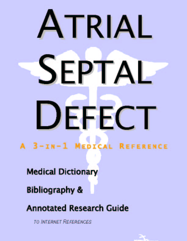 Forward Chapter 1. Studies on Atrial Septal Defect Overview The Combined Health Information Database Federally Funded Research on Atrial Septal Defect E-Journals: PubMed Central The National Library of Medicine: PubMed Chapter 2. Nutrition and Atrial Septal Defect Overview Finding Nutrition Studies on Atrial Septal Defect Federal Resources on Nutrition Additional Web Resources Chapter 3. Patents on Atrial Septal Defect Overview Patents on Atrial Septal Defect Patent Applications on Atrial Septal Defect Keeping Current Chapter 4. Books on Atrial Septal Defect Overview Chapters on Atrial Septal Defect Appendix A. Physician Resources Overview NIH Guidelines NIH Databases Other Commercial Databases Appendix B. Patient Resources Overview Patient Guideline Sources Finding Associations Appendix C. Finding Medical Libraries Overview Preparation Finding a Local Medical Library Medical Libraries in the U.S. and Canada ONLINE GLOSSARIES Online Dictionary Directories ATRIAL SEPTAL DEFECT DICTIONARY INDEX |