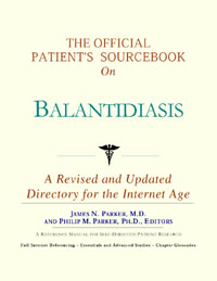Since the late 1990s, physicians have seen a general increase in patient Internet usage rates. Patients frequently enter their doctor’s offices with printed Web pages of home remedies in the guise of latest medical research. This scenario is so common that doctors often spend more time dispelling misleading information than guiding patients through sound therapies. The Official Patient’s Sourcebook on Balantidiasis has been created for patients who have decided to make education and research an integral part of the treatment process. The pages that follow will tell you where and how to look for information covering virtually all topics related to balantidiasis, from the essentials to the most advanced areas of research. The title of this book includes the word “official.” This reflects the fact that the sourcebook draws from public, academic, government, and peer-reviewed research. Selected readings from various agencies are reproduced to give you some of the latest official information available to date on balantidiasis. Given patients’ increasing sophistication in using the Internet, abundant references to reliable Internet-based resources are provided throughout this sourcebook. Where possible, guidance is provided on how to obtain free-of-charge, primary research results as well as more detailed information via the Internet. E-book and electronic versions of this sourcebook are fully interactive with each of the Internet sites mentioned (clicking on a hyperlink automatically opens your browser to the site indicated). Hard copy users of this sourcebook can type cited Web addresses directly into their browsers to obtain access to the corresponding sites. Since we are working with ICON Health Publications, hard copy Sourcebooks are frequently updated and printed on demand to ensure that the information provided is current. In addition to extensive references accessible via the Internet, every chapter presents a “Vocabulary Builder.” Many health guides offer glossaries of technical or uncommon terms in an appendix. In editing this sourcebook, we have decided to place a smaller glossary within each chapter that covers terms used in that chapter. Given the technical nature of some chapters, you may need to revisit many sections. Building one’s vocabulary of medical terms in such a gradual manner has been shown to improve the learning process. We must emphasize that no sourcebook on balantidiasis should affirm that a specific diagnostic procedure or treatment discussed in a research study, patent, or doctoral dissertation is “correct” or your best option. This sourcebook is no exception. Each patient is unique. Deciding on appropriate options is always up to the patient in consultation with their physician and healthcare providers. Organization This sourcebook is organized into three parts. Part I explores basic techniques to researching balantidiasis (e.g. finding guidelines on diagnosis, treatments, and prognosis), followed by a number of topics, including information on how to get in touch with organizations, associations, or other patient networks dedicated to balantidiasis. It also gives you sources of information that can help you find a doctor in your local area specializing in treating balantidiasis. Collectively, the material presented in Part I is a complete primer on basic research topics for patients with balantidiasis. Part II moves on to advanced research dedicated to balantidiasis. Part II is intended for those willing to invest many hours of hard work and study. It is here that we direct you to the latest scientific and applied research on balantidiasis. When possible, contact names, links via the Internet, and summaries are provided. It is in Part II where the vocabulary process becomes important as authors publishing advanced research frequently use highly specialized language. In general, every attempt is made to recommend “free-to-use” options. Part III provides appendices of useful background reading for all patients with balantidiasis or related disorders. The appendices are dedicated to more pragmatic issues faced by many patients with balantidiasis. Accessing materials via medical libraries may be the only option for some readers, so a guide is provided for finding local medical libraries which are open to the public. Part III, therefore, focuses on advice that goes beyond the biological and scientific issues facing patients with balantidiasis. Scope While this sourcebook covers balantidiasis, your doctor, research publications, and specialists may refer to your condition using a variety of terms. Therefore, you should understand that balantidiasis is often considered a synonym or a condition closely related to the following: