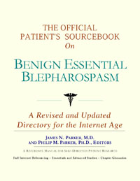 Since the late 1990s, physicians have seen a general increase in patient Internet usage rates. Patients frequently enter their doctor’s offices with printed Web pages of home remedies in the guise of latest medical research. This scenario is so common that doctors often spend more time dispelling misleading information than guiding patients through sound therapies. The Official Patient’s Sourcebook on Benign Essential Blepharospasm has been created for patients who have decided to make education and research an integral part of the treatment process. The pages that follow will tell you where and how to look for information covering virtually all topics related to benign essential blepharospasm, from the essentials to the most advanced areas of research. The title of this book includes the word “official.” This reflects the fact that the sourcebook draws from public, academic, government, and peer-reviewed research. Selected readings from various agencies are reproduced to give you some of the latest official information available to date on benign essential blepharospasm. Given patients’ increasing sophistication in using the Internet, abundant references to reliable Internet-based resources are provided throughout this sourcebook. Where possible, guidance is provided on how to obtain free-of-charge, primary research results as well as more detailed information via the Internet. E-book and electronic versions of this sourcebook are fully interactive with each of the Internet sites mentioned (clicking on a hyperlink automatically opens your browser to the site indicated). Hard copy users of this sourcebook can type cited Web addresses directly into their browsers to obtain access to the corresponding sites. Since we are working with ICON Health Publications, hard copy Sourcebooks are frequently updated and printed on demand to ensure that the information provided is current. In addition to extensive references accessible via the Internet, every chapter presents a “Vocabulary Builder.” Many health guides offer glossaries of technical or uncommon terms in an appendix. In editing this sourcebook, we have decided to place a smaller glossary within each chapter that covers terms used in that chapter. Given the technical nature of some chapters, you may need to revisit many sections. Building one’s vocabulary of medical terms in such a gradual manner has been shown to improve the learning process. We must emphasize that no sourcebook on benign essential blepharospasm should affirm that a specific diagnostic procedure or treatment discussed in a research study, patent, or doctoral dissertation is “correct” or your best option. This sourcebook is no exception. Each patient is unique. Deciding on appropriate options is always up to the patient in consultation with their physician and healthcare providers. Organization This sourcebook is organized into three parts. Part I explores basic techniques to researching benign essential blepharospasm (e.g. finding guidelines on diagnosis, treatments, and prognosis), followed by a number of topics, including information on how to get in touch with organizations, associations, or other patient networks dedicated to benign essential blepharospasm. It also gives you sources of information that can help you find a doctor in your local area specializing in treating benign essential blepharospasm. Collectively, the material presented in Part I is a complete primer on basic research topics for patients with benign essential blepharospasm. Part II moves on to advanced research dedicated to benign essential blepharospasm. Part II is intended for those willing to invest many hours of hard work and study. It is here that we direct you to the latest scientific and applied research on benign essential blepharospasm. When possible, contact names, links via the Internet, and summaries are provided. It is in Part II where the vocabulary process becomes important as authors publishing advanced research frequently use highly specialized language. In general, every attempt is made to recommend “free-to-use” options. Part III provides appendices of useful background reading for all patients with benign essential blepharospasm or related disorders. The appendices are dedicated to more pragmatic issues faced by many patients with benign essential blepharospasm. Accessing materials via medical libraries may be the only option for some readers, so a guide is provided for finding local medical libraries which are open to the public. Part III, therefore, focuses on advice that goes beyond the biological and scientific issues facing patients with benign essential blepharospasm. Scope While this sourcebook covers benign essential blepharospasm, your doctor, research publications, and specialists may refer to your condition using a variety of terms. Therefore, you should understand that benign essential blepharospasm is often considered a synonym or a condition closely related to the following:
