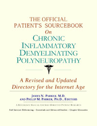 Since the late 1990s, physicians have seen a general increase in patient Internet usage rates. Patients frequently enter their doctor’s offices with printed Web pages of home remedies in the guise of latest medical research. This scenario is so common that doctors often spend more time dispelling misleading information than guiding patients through sound therapies. The Official Patient’s Sourcebook on Chronic Inflammatory Demyelinating Polyneuropathy has been created for patients who have decided to make education and research an integral part of the treatment process. The pages that follow will tell you where and how to look for information covering virtually all topics related to chronic inflammatory demyelinating polyneuropathy, from the essentials to the most advanced areas of research. The title of this book includes the word “official.” This reflects the fact that the sourcebook draws from public, academic, government, and peer-reviewed research. Selected readings from various agencies are reproduced to give you some of the latest official information available to date on chronic inflammatory demyelinating polyneuropathy. Given patients’ increasing sophistication in using the Internet, abundant references to reliable Internet-based resources are provided throughout this sourcebook. Where possible, guidance is provided on how to obtain free-of-charge, primary research results as well as more detailed information via the Internet. E-book and electronic versions of this sourcebook are fully interactive with each of the Internet sites mentioned (clicking on a hyperlink automatically opens your browser to the site indicated). Hard copy users of this sourcebook can type cited Web addresses directly into their browsers to obtain access to the corresponding sites. Since we are working with ICON Health Publications, hard copy Sourcebooks are frequently updated and printed on demand to ensure that the information provided is current. In addition to extensive references accessible via the Internet, every chapter presents a “Vocabulary Builder.” Many health guides offer glossaries of technical or uncommon terms in an appendix. In editing this sourcebook, we have decided to place a smaller glossary within each chapter that covers terms used in that chapter. Given the technical nature of some chapters, you may need to revisit many sections. Building one’s vocabulary of medical terms in such a gradual manner has been shown to improve the learning process. We must emphasize that no sourcebook on chronic inflammatory demyelinating polyneuropathy should affirm that a specific diagnostic procedure or treatment discussed in a research study, patent, or doctoral dissertation is “correct” or your best option. This sourcebook is no exception. Each patient is unique. Deciding on appropriate options is always up to the patient in consultation with their physician and healthcare providers. Organization This sourcebook is organized into three parts. Part I explores basic techniques to researching chronic inflammatory demyelinating polyneuropathy (e.g. finding guidelines on diagnosis, treatments, and prognosis), followed by a number of topics, including information on how to get in touch with organizations, associations, or other patient networks dedicated to chronic inflammatory demyelinating polyneuropathy. It also gives you sources of information that can help you find a doctor in your local area specializing in treating chronic inflammatory demyelinating polyneuropathy. Collectively, the material presented in Part I is a complete primer on basic research topics for patients with chronic inflammatory demyelinating polyneuropathy. Part II moves on to advanced research dedicated to chronic inflammatory demyelinating polyneuropathy. Part II is intended for those willing to invest many hours of hard work and study. It is here that we direct you to the latest scientific and applied research on chronic inflammatory demyelinating polyneuropathy. When possible, contact names, links via the Internet, and summaries are provided. It is in Part II where the vocabulary process becomes important as authors publishing advanced research frequently use highly specialized language. In general, every attempt is made to recommend “free-to-use” options. Part III provides appendices of useful background reading for all patients with chronic inflammatory demyelinating polyneuropathy or related disorders. The appendices are dedicated to more pragmatic issues faced by many patients with chronic inflammatory demyelinating polyneuropathy. Accessing materials via medical libraries may be the only option for some readers, so a guide is provided for finding local medical libraries which are open to the public. Part III, therefore, focuses on advice that goes beyond the biological and scientific issues facing patients with chronic inflammatory demyelinating polyneuropathy. Scope While this sourcebook covers chronic inflammatory demyelinating polyneuropathy, your doctor, research publications, and specialists may refer to your condition using a variety of terms. Therefore, you should understand that chronic inflammatory demyelinating polyneuropathy is often considered a synonym or a condition closely related to the following: