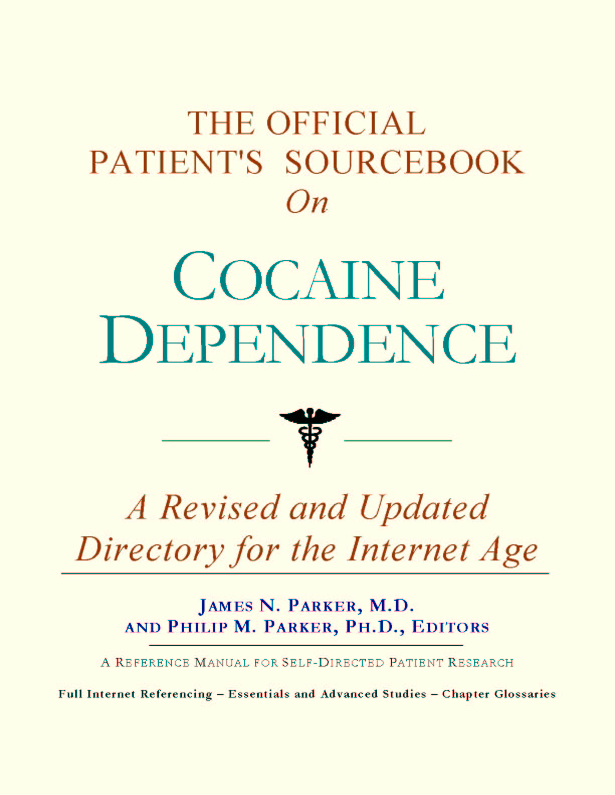 Since the late 1990s, physicians have seen a general increase in patient Internet usage rates. Patients frequently enter their doctor's offices with printed Web pages of home remedies in the guise of latest medical research. This scenario is so common that doctors often spend more time dispelling misleading information than guiding patients through sound therapies. The Official Patient’s Sourcebook on Cocaine Dependence has been created for patients who have decided to make education and research an integral part of the treatment process. The pages that follow will tell you where and how to look for information covering virtually all topics related to cocaine dependence, from the essentials to the most advanced areas of research. The title of this book includes the word “official.” This reflects the fact that the sourcebook draws from public, academic, government, and peer-reviewed research. Selected readings from various agencies are reproduced to give you some of the latest official information available to date on cocaine dependence. Given patients’ increasing sophistication in using the Internet, abundant references to reliable Internet-based resources are provided throughout this sourcebook. Where possible, guidance is provided on how to obtain free-of-charge, primary research results as well as more detailed information via the Internet. E-book and electronic versions of this sourcebook are fully interactive with each of the Internet sites mentioned (clicking on a hyperlink automatically opens your browser to the site indicated). Hard copy users of this sourcebook can type cited Web addresses directly into their browsers to obtain access to the corresponding sites. Since we are working with ICON Health Publications, hard copy Sourcebooks are frequently updated and printed on demand to ensure that the information provided is current. In addition to extensive references accessible via the Internet, every chapter presents a “Vocabulary Builder.” Many health guides offer glossaries of technical or uncommon terms in an appendix. In editing this sourcebook, we have decided to place a smaller glossary within each chapter that covers terms used in that chapter. Given the technical nature of some chapters, you may need to revisit many sections. Building one’s vocabulary of medical terms in such a gradual manner has been shown to improve the learning process. We must emphasize that no sourcebook on cocaine dependence should affirm that a specific diagnostic procedure or treatment discussed in a research study, patent, or doctoral dissertation is “correct” or your best option. This sourcebook is no exception. Each patient is unique. Deciding on appropriate options is always up to the patient in consultation with their physician and healthcare providers. Organization This sourcebook is organized into three parts. Part I explores basic techniques to researching cocaine dependence (e.g. finding guidelines on diagnosis, treatments, and prognosis), followed by a number of topics, including information on how to get in touch with organizations, associations, or other patient networks dedicated to cocaine dependence. It also gives you sources of information that can help you find a doctor in your local area specializing in treating cocaine dependence. Collectively, the material presented in Part I is a complete primer on basic research topics for patients with cocaine dependence. Part II moves on to advanced research dedicated to cocaine dependence. Part II is intended for those willing to invest many hours of hard work and study. It is here that we direct you to the latest scientific and applied research on cocaine dependence. When possible, contact names, links via the Internet, and summaries are provided. It is in Part II where the vocabulary process becomes important as authors publishing advanced research frequently use highly specialized language. In general, every attempt is made to recommend “free-to-use” options. Part III provides appendices of useful background reading for all patients with cocaine dependence or related disorders. The appendices are dedicated to more pragmatic issues faced by many patients with cocaine dependence. Accessing materials via medical libraries may be the only option for some readers, so a guide is provided for finding local medical libraries which are open to the public. Part III, therefore, focuses on advice that goes beyond the biological and scientific issues facing patients with cocaine dependence. Scope While this sourcebook covers cocaine dependence, your doctor, research publications, and specialists may refer to your condition using a variety of terms. Therefore, you should understand that cocaine dependence is often considered a synonym or a condition closely related to the following:
