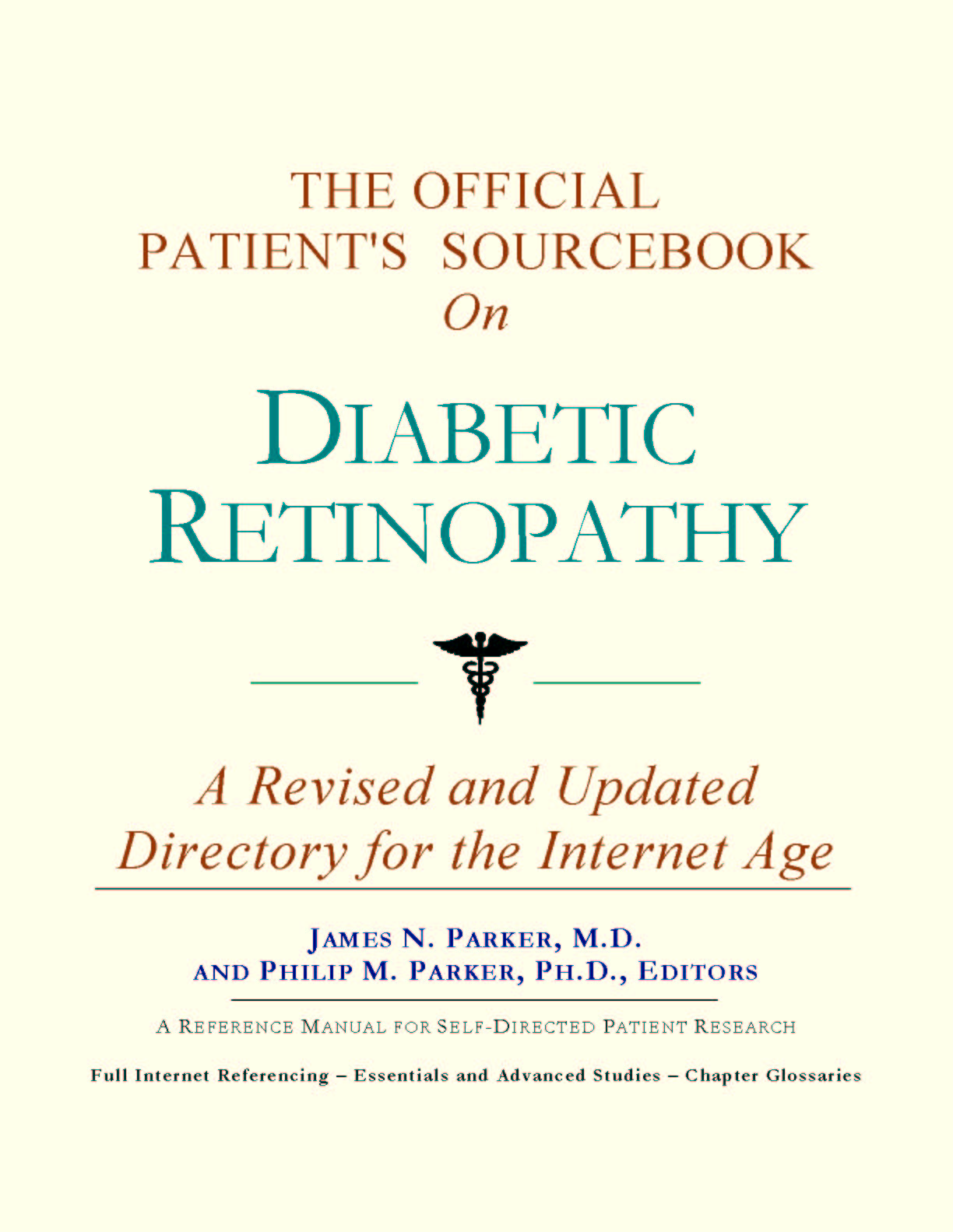 Since the late 1990s, physicians have seen a general increase in patient Internet usage rates. Patients frequently enter their doctor's offices with printed Web pages of home remedies in the guise of latest medical research. This scenario is so common that doctors often spend more time dispelling misleading information than guiding patients through sound therapies. The Official Patient’s Sourcebook on Diabetic Retinopathy has been created for patients who have decided to make education and research an integral part of the treatment process. The pages that follow will tell you where and how to look for information covering virtually all topics related to diabetic retinopathy, from the essentials to the most advanced areas of research. The title of this book includes the word “official.” This reflects the fact that the sourcebook draws from public, academic, government, and peer-reviewed research. Selected readings from various agencies are reproduced to give you some of the latest official information available to date on diabetic retinopathy. Given patients’ increasing sophistication in using the Internet, abundant references to reliable Internet-based resources are provided throughout this sourcebook. Where possible, guidance is provided on how to obtain free-of-charge, primary research results as well as more detailed information via the Internet. E-book and electronic versions of this sourcebook are fully interactive with each of the Internet sites mentioned (clicking on a hyperlink automatically opens your browser to the site indicated). Hard copy users of this sourcebook can type cited Web addresses directly into their browsers to obtain access to the corresponding sites. Since we are working with ICON Health Publications, hard copy Sourcebooks are frequently updated and printed on demand to ensure that the information provided is current. In addition to extensive references accessible via the Internet, every chapter presents a “Vocabulary Builder.” Many health guides offer glossaries of technical or uncommon terms in an appendix. In editing this sourcebook, we have decided to place a smaller glossary within each chapter that covers terms used in that chapter. Given the technical nature of some chapters, you may need to revisit many sections. Building one’s vocabulary of medical terms in such a gradual manner has been shown to improve the learning process. We must emphasize that no sourcebook on diabetic retinopathy should affirm that a specific diagnostic procedure or treatment discussed in a research study, patent, or doctoral dissertation is “correct” or your best option. This sourcebook is no exception. Each patient is unique. Deciding on appropriate options is always up to the patient in consultation with their physician and healthcare providers. Organization This sourcebook is organized into three parts. Part I explores basic techniques to researching diabetic retinopathy (e.g. finding guidelines on diagnosis, treatments, and prognosis), followed by a number of topics, including information on how to get in touch with organizations, associations, or other patient networks dedicated to diabetic retinopathy. It also gives you sources of information that can help you find a doctor in your local area specializing in treating diabetic retinopathy. Collectively, the material presented in Part I is a complete primer on basic research topics for patients with diabetic retinopathy. Part II moves on to advanced research dedicated to diabetic retinopathy. Part II is intended for those willing to invest many hours of hard work and study. It is here that we direct you to the latest scientific and applied research on diabetic retinopathy. When possible, contact names, links via the Internet, and summaries are provided. It is in Part II where the vocabulary process becomes important as authors publishing advanced research frequently use highly specialized language. In general, every attempt is made to recommend “free-to-use” options. Part III provides appendices of useful background reading for all patients with diabetic retinopathy or related disorders. The appendices are dedicated to more pragmatic issues faced by many patients with diabetic retinopathy. Accessing materials via medical libraries may be the only option for some readers, so a guide is provided for finding local medical libraries which are open to the public. Part III, therefore, focuses on advice that goes beyond the biological and scientific issues facing patients with diabetic retinopathy. Scope While this sourcebook covers diabetic retinopathy, your doctor, research publications, and specialists may refer to your condition using a variety of terms. Therefore, you should understand that diabetic retinopathy is often considered a synonym or a condition closely related to the following: