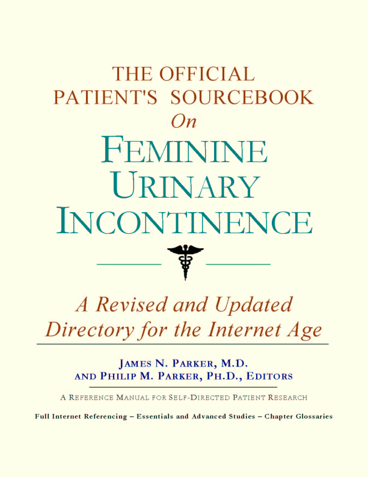 Since the late 1990s, physicians have seen a general increase in patient Internet usage rates. Patients frequently enter their doctor's offices with printed Web pages of home remedies in the guise of latest medical research. This scenario is so common that doctors often spend more time dispelling misleading information than guiding patients through sound therapies. The Official Patient’s Sourcebook on Feminine Urinary Incontinence has been created for patients who have decided to make education and research an integral part of the treatment process. The pages that follow will tell you where and how to look for information covering virtually all topics related to feminine urinary incontinence, from the essentials to the most advanced areas of research. The title of this book includes the word “official.” This reflects the fact that the sourcebook draws from public, academic, government, and peer-reviewed research. Selected readings from various agencies are reproduced to give you some of the latest official information available to date on feminine urinary incontinence. Given patients’ increasing sophistication in using the Internet, abundant references to reliable Internet-based resources are provided throughout this sourcebook. Where possible, guidance is provided on how to obtain free-of-charge, primary research results as well as more detailed information via the Internet. E-book and electronic versions of this sourcebook are fully interactive with each of the Internet sites mentioned (clicking on a hyperlink automatically opens your browser to the site indicated). Hard copy users of this sourcebook can type cited Web addresses directly into their browsers to obtain access to the corresponding sites. Since we are working with ICON Health Publications, hard copy Sourcebooks are frequently updated and printed on demand to ensure that the information provided is current. In addition to extensive references accessible via the Internet, every chapter presents a “Vocabulary Builder.” Many health guides offer glossaries of technical or uncommon terms in an appendix. In editing this sourcebook, we have decided to place a smaller glossary within each chapter that covers terms used in that chapter. Given the technical nature of some chapters, you may need to revisit many sections. Building one’s vocabulary of medical terms in such a gradual manner has been shown to improve the learning process. We must emphasize that no sourcebook on feminine urinary incontinence should affirm that a specific diagnostic procedure or treatment discussed in a research study, patent, or doctoral dissertation is “correct” or your best option. This sourcebook is no exception. Each patient is unique. Deciding on appropriate options is always up to the patient in consultation with their physician and healthcare providers. Organization This sourcebook is organized into three parts. Part I explores basic techniques to researching feminine urinary incontinence (e.g. finding guidelines on diagnosis, treatments, and prognosis), followed by a number of topics, including information on how to get in touch with organizations, associations, or other patient networks dedicated to feminine urinary incontinence. It also gives you sources of information that can help you find a doctor in your local area specializing in treating feminine urinary incontinence. Collectively, the material presented in Part I is a complete primer on basic research topics for patients with feminine urinary incontinence. Part II moves on to advanced research dedicated to feminine urinary incontinence. Part II is intended for those willing to invest many hours of hard work and study. It is here that we direct you to the latest scientific and applied research on feminine urinary incontinence. When possible, contact names, links via the Internet, and summaries are provided. It is in Part II where the vocabulary process becomes important as authors publishing advanced research frequently use highly specialized language. In general, every attempt is made to recommend “free-to-use” options. Part III provides appendices of useful background reading for all patients with feminine urinary incontinence or related disorders. The appendices are dedicated to more pragmatic issues faced by many patients with feminine urinary incontinence. Accessing materials via medical libraries may be the only option for some readers, so a guide is provided for finding local medical libraries which are open to the public. Part III, therefore, focuses on advice that goes beyond the biological and scientific issues facing patients with feminine urinary incontinence. Scope While this sourcebook covers feminine urinary incontinence, your doctor, research publications, and specialists may refer to your condition using a variety of terms. Therefore, you should understand that feminine urinary incontinence is often considered a synonym or a condition closely related to the following: