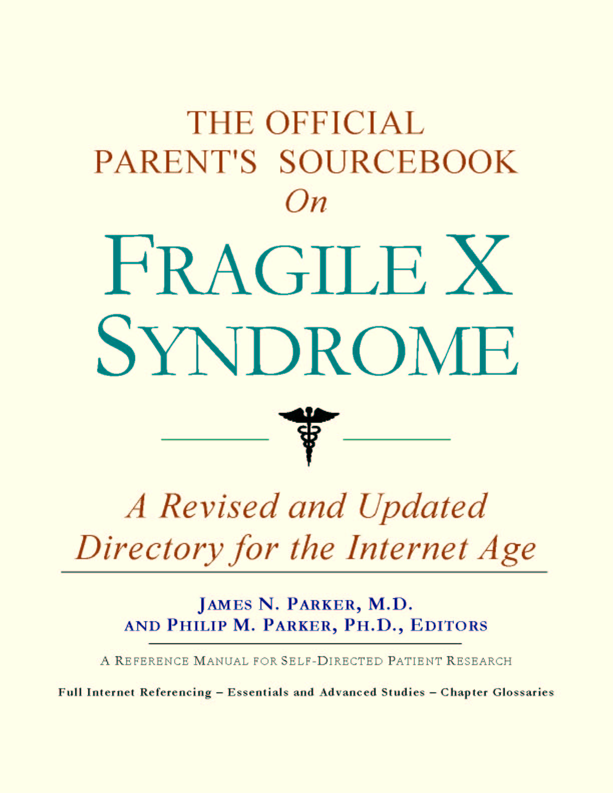 Since the late 1990s, physicians have seen a general increase in parent Internet usage rates. Parents frequently enter their children’s doctor's offices with printed Web pages of home remedies in the guise of latest medical research. This scenario is so common that doctors often spend more time dispelling misleading information than guiding children through sound therapies. The Official Parent’s Sourcebook on Fragile X Syndrome has been created for parents who have decided to make education and research an integral part of the treatment process. The pages that follow will tell you where and how to look for information covering virtually all topics related to Fragile X syndrome, from the essentials to the most advanced areas of research. The title of this book includes the word “official.” This reflects the fact that the sourcebook draws from public, academic, government, and peer-reviewed research. Selected readings from various agencies are reproduced to give you some of the latest official information available to date on Fragile X syndrome. Given parents’ increasing sophistication in using the Internet, abundant references to reliable Internet-based resources are provided throughout this sourcebook. Where possible, guidance is provided on how to obtain free-of-charge, primary research results as well as more detailed information via the Internet. E-book and electronic versions of this sourcebook are fully interactive with each of the Internet sites mentioned (clicking on a hyperlink automatically opens your browser to the site indicated). Hard copy users of this sourcebook can type cited Web addresses directly into their browsers to obtain access to the corresponding sites. Since we are working with ICON Health Publications, hard copy Sourcebooks are frequently updated and printed on demand to ensure that the information provided is current. In addition to extensive references accessible via the Internet, every chapter presents a “Vocabulary Builder.” Many health guides offer glossaries of technical or uncommon terms in an appendix. In editing this sourcebook, we have decided to place a smaller glossary within each chapter that covers terms used in that chapter. Given the technical nature of some chapters, you may need to revisit many sections. Building one’s vocabulary of medical terms in such a gradual manner has been shown to improve the learning process. We must emphasize that no sourcebook on Fragile X syndrome should affirm that a specific diagnostic procedure or treatment discussed in a research study, patent, or doctoral dissertation is “correct” or your child’s best option. This sourcebook is no exception. Each child is unique. Deciding on appropriate options is always up to parents in consultation with their children’s physicians and healthcare providers. Organization This sourcebook is organized into three parts. Part I explores basic techniques to researching Fragile X syndrome (e.g. finding guidelines on diagnosis, treatments, and prognosis), followed by a number of topics, including information on how to get in touch with organizations, associations, or other parent networks dedicated to Fragile X syndrome. It also gives you sources of information that can help you find a doctor in your local area specializing in treating Fragile X syndrome. Collectively, the material presented in Part I is a complete primer on basic research topics for Fragile X syndrome. Part II moves on to advanced research dedicated to Fragile X syndrome. Part II is intended for those willing to invest many hours of hard work and study. It is here that we direct you to the latest scientific and applied research on Fragile X syndrome. When possible, contact names, links via the Internet, and summaries are provided. It is in Part II where the vocabulary process becomes important as authors publishing advanced research frequently use highly specialized language. In general, every attempt is made to recommend “free-to-use” options. Part III provides appendices of useful background reading covering Fragile X syndrome or related disorders. The appendices are dedicated to more pragmatic issues facing parents. Accessing materials via medical libraries may be the only option for some parents, so a guide is provided for finding local medical libraries which are open to the public. Part III, therefore, focuses on advice that goes beyond the biological and scientific issues facing children with Fragile X syndrome and their families. Scope While this sourcebook covers Fragile X syndrome, doctors, research publications, and specialists may refer to your child’s condition using a variety of terms. Therefore, you should understand that Fragile X syndrome is often considered a synonym or a condition closely related to the following: