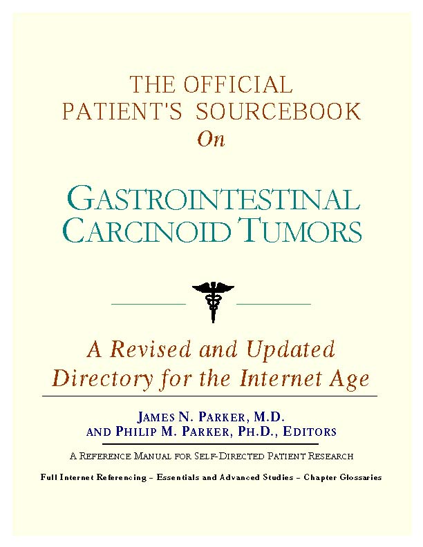 Since the late 1990s, physicians have seen a general increase in patient Internet usage rates. Patients frequently enter their doctor's offices with printed Web pages of home remedies in the guise of latest medical research. This scenario is so common that doctors often spend more time dispelling misleading information than guiding patients through sound therapies. The Official Patient’s Sourcebook on Gastrointestinal Carcinoid Tumors has been created for patients who have decided to make education and research an integral part of the treatment process. The pages that follow will tell you where and how to look for information covering virtually all topics related to gastrointestinal carcinoid tumors, from the essentials to the most advanced areas of research. The title of this book includes the word “official.” This reflects the fact that the sourcebook draws from public, academic, government, and peer-reviewed research. Selected readings from various agencies are reproduced to give you some of the latest official information available to date on gastrointestinal carcinoid tumors. Given patients’ increasing sophistication in using the Internet, abundant references to reliable Internet-based resources are provided throughout this sourcebook. Where possible, guidance is provided on how to obtain free-of-charge, primary research results as well as more detailed information via the Internet. E-book and electronic versions of this sourcebook are fully interactive with each of the Internet sites mentioned (clicking on a hyperlink automatically opens your browser to the site indicated). Hard copy users of this sourcebook can type cited Web addresses directly into their browsers to obtain access to the corresponding sites. Since we are working with ICON Health Publications, hard copy Sourcebooks are frequently updated and printed on demand to ensure that the information provided is current. In addition to extensive references accessible via the Internet, every chapter presents a “Vocabulary Builder.” Many health guides offer glossaries of technical or uncommon terms in an appendix. In editing this sourcebook, we have decided to place a smaller glossary within each chapter that covers terms used in that chapter. Given the technical nature of some chapters, you may need to revisit many sections. Building one’s vocabulary of medical terms in such a gradual manner has been shown to improve the learning process. We must emphasize that no sourcebook on gastrointestinal carcinoid tumors should affirm that a specific diagnostic procedure or treatment discussed in a research study, patent, or doctoral dissertation is “correct” or your best option. This sourcebook is no exception. Each patient is unique. Deciding on appropriate options is always up to the patient in consultation with their physician and healthcare providers. Organization This sourcebook is organized into three parts. Part I explores basic techniques to researching gastrointestinal carcinoid tumors (e.g. finding guidelines on diagnosis, treatments, and prognosis), followed by a number of topics, including information on how to get in touch with organizations, associations, or other patient networks dedicated to gastrointestinal carcinoid tumors. It also gives you sources of information that can help you find a doctor in your local area specializing in treating gastrointestinal carcinoid tumors. Collectively, the material presented in Part I is a complete primer on basic research topics for patients with gastrointestinal carcinoid tumors. Part II moves on to advanced research dedicated to gastrointestinal carcinoid tumors. Part II is intended for those willing to invest many hours of hard work and study. It is here that we direct you to the latest scientific and applied research on gastrointestinal carcinoid tumors. When possible, contact names, links via the Internet, and summaries are provided. It is in Part II where the vocabulary process becomes important as authors publishing advanced research frequently use highly specialized language. In general, every attempt is made to recommend “free-to-use” options. Part III provides appendices of useful background reading for all patients with gastrointestinal carcinoid tumors or related disorders. The appendices are dedicated to more pragmatic issues faced by many patients with gastrointestinal carcinoid tumors. Accessing materials via medical libraries may be the only option for some readers, so a guide is provided for finding local medical libraries which are open to the public. Part III, therefore, focuses on advice that goes beyond the biological and scientific issues facing patients with gastrointestinal carcinoid tumors. Scope While this sourcebook covers gastrointestinal carcinoid tumors, your doctor, research publications, and specialists may refer to your condition using a variety of terms. Therefore, you should understand that gastrointestinal carcinoid tumors is often considered a synonym or a condition closely related to the following: