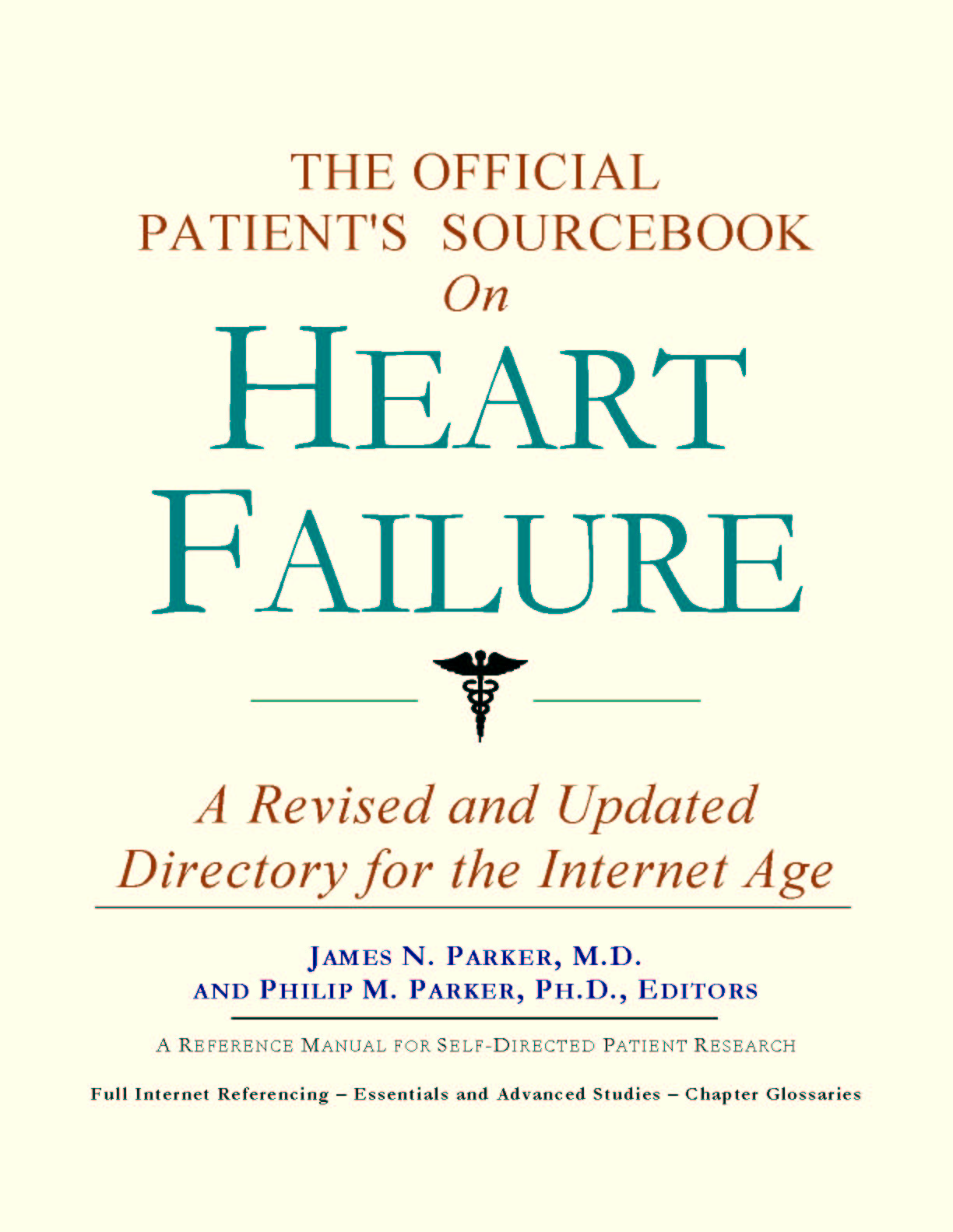 Since the late 1990s, physicians have seen a general increase in patient Internet usage rates. Patients frequently enter their doctor’s offices with printed Web pages of home remedies in the guise of latest medical research. This scenario is so common that doctors often spend more time dispelling misleading information than guiding patients through sound therapies. The Official Patient’s Sourcebook on Heart Failure has been created for patients who have decided to make education and research an integral part of the treatment process. The pages that follow will tell you where and how to look for information covering virtually all topics related to heart failure, from the essentials to the most advanced areas of research. The title of this book includes the word “official.” This reflects the fact that the sourcebook draws from public, academic, government, and peer-reviewed research. Selected readings from various agencies are reproduced to give you some of the latest official information available to date on heart failure. Given patients’ increasing sophistication in using the Internet, abundant references to reliable Internet-based resources are provided throughout this sourcebook. Where possible, guidance is provided on how to obtain free-of-charge, primary research results as well as more detailed information via the Internet. E-book and electronic versions of this sourcebook are fully interactive with each of the Internet sites mentioned (clicking on a hyperlink automatically opens your browser to the site indicated). Hard copy users of this sourcebook can type cited Web addresses directly into their browsers to obtain access to the corresponding sites. Since we are working with ICON Health Publications, hard copy Sourcebooks are frequently updated and printed on demand to ensure that the information provided is current. In addition to extensive references accessible via the Internet, every chapter presents a “Vocabulary Builder.” Many health guides offer glossaries of technical or uncommon terms in an appendix. In editing this sourcebook, we have decided to place a smaller glossary within each chapter that covers terms used in that chapter. Given the technical nature of some chapters, you may need to revisit many sections. Building one’s vocabulary of medical terms in such a gradual manner has been shown to improve the learning process. We must emphasize that no sourcebook on heart failure should affirm that a specific diagnostic procedure or treatment discussed in a research study, patent, or doctoral dissertation is “correct” or your best option. This sourcebook is no exception. Each patient is unique. Deciding on appropriate options is always up to the patient in consultation with their physician and healthcare providers. Organization This sourcebook is organized into three parts. Part I explores basic techniques to researching heart failure (e.g. finding guidelines on diagnosis, treatments, and prognosis), followed by a number of topics, including information on how to get in touch with organizations, associations, or other patient networks dedicated to heart failure. It also gives you sources of information that can help you find a doctor in your local area specializing in treating heart failure. Collectively, the material presented in Part I is a complete primer on basic research topics for patients with heart failure. Part II moves on to advanced research dedicated to heart failure. Part II is intended for those willing to invest many hours of hard work and study. It is here that we direct you to the latest scientific and applied research on heart failure. When possible, contact names, links via the Internet, and summaries are provided. It is in Part II where the vocabulary process becomes important as authors publishing advanced research frequently use highly specialized language. In general, every attempt is made to recommend “free-to-use” options. Part III provides appendices of useful background reading for all patients with heart failure or related disorders. The appendices are dedicated to more pragmatic issues faced by many patients with heart failure. Accessing materials via medical libraries may be the only option for some readers, so a guide is provided for finding local medical libraries which are open to the public. Part III, therefore, focuses on advice that goes beyond the biological and scientific issues facing patients with heart failure. Scope While this sourcebook covers heart failure, your doctor, research publications, and specialists may refer to your condition using a variety of terms. Therefore, you should understand that heart failure is often considered a synonym or a condition closely related to the following:
