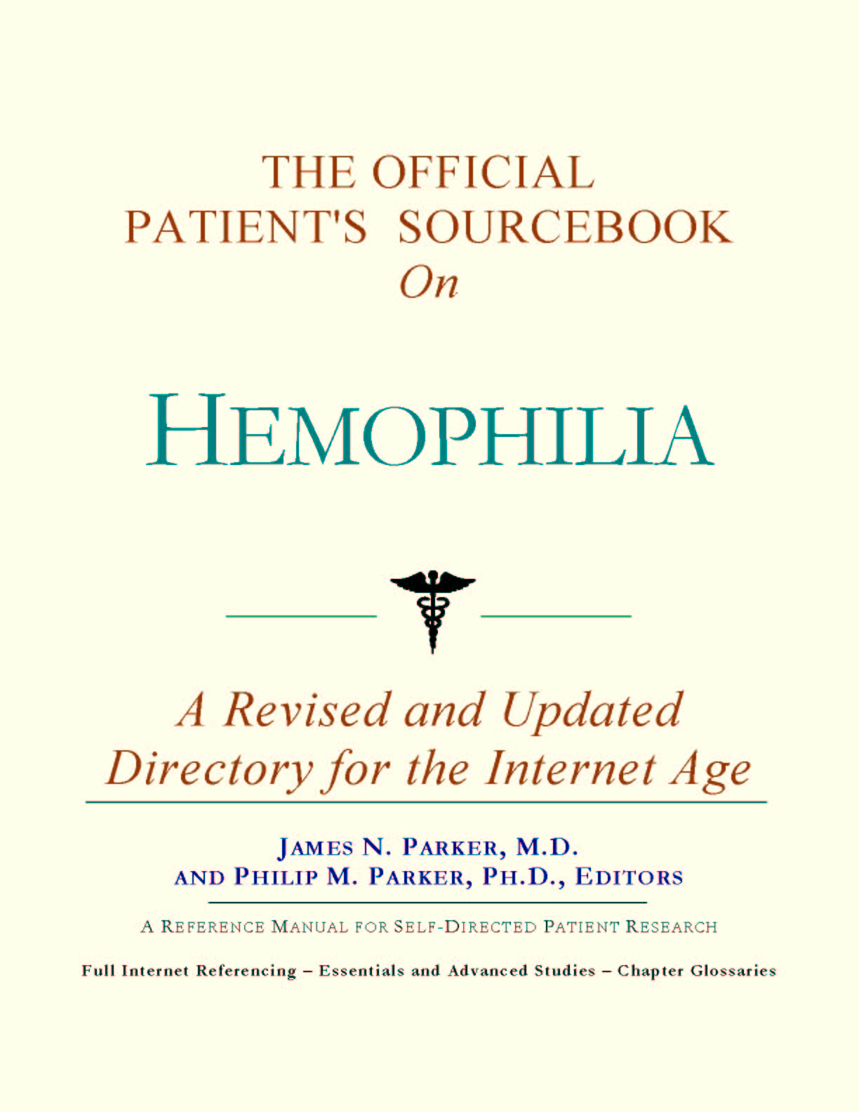 Since the late 1990s, physicians have seen a general increase in patient Internet usage rates. Patients frequently enter their doctor's offices with printed Web pages of home remedies in the guise of latest medical research. This scenario is so common that doctors often spend more time dispelling misleading information than guiding patients through sound therapies. The Official Patient’s Sourcebook on Hemophilia has been created for patients who have decided to make education and research an integral part of the treatment process. The pages that follow will tell you where and how to look for information covering virtually all topics related to hemophilia, from the essentials to the most advanced areas of research. The title of this book includes the word “official.” This reflects the fact that the sourcebook draws from public, academic, government, and peer-reviewed research. Selected readings from various agencies are reproduced to give you some of the latest official information available to date on hemophilia. Given patients’ increasing sophistication in using the Internet, abundant references to reliable Internet-based resources are provided throughout this sourcebook. Where possible, guidance is provided on how to obtain free-of-charge, primary research results as well as more detailed information via the Internet. E-book and electronic versions of this sourcebook are fully interactive with each of the Internet sites mentioned (clicking on a hyperlink automatically opens your browser to the site indicated). Hard copy users of this sourcebook can type cited Web addresses directly into their browsers to obtain access to the corresponding sites. Since we are working with ICON Health Publications, hard copy Sourcebooks are frequently updated and printed on demand to ensure that the information provided is current. In addition to extensive references accessible via the Internet, every chapter presents a “Vocabulary Builder.” Many health guides offer glossaries of technical or uncommon terms in an appendix. In editing this sourcebook, we have decided to place a smaller glossary within each chapter that covers terms used in that chapter. Given the technical nature of some chapters, you may need to revisit many sections. Building one’s vocabulary of medical terms in such a gradual manner has been shown to improve the learning process. We must emphasize that no sourcebook on hemophilia should affirm that a specific diagnostic procedure or treatment discussed in a research study, patent, or doctoral dissertation is “correct” or your best option. This sourcebook is no exception. Each patient is unique. Deciding on appropriate options is always up to the patient in consultation with their physician and healthcare providers. Organization This sourcebook is organized into three parts. Part I explores basic techniques to researching hemophilia (e.g. finding guidelines on diagnosis, treatments, and prognosis), followed by a number of topics, including information on how to get in touch with organizations, associations, or other patient networks dedicated to hemophilia. It also gives you sources of information that can help you find a doctor in your local area specializing in treating hemophilia. Collectively, the material presented in Part I is a complete primer on basic research topics for patients with hemophilia. Part II moves on to advanced research dedicated to hemophilia. Part II is intended for those willing to invest many hours of hard work and study. It is here that we direct you to the latest scientific and applied research on hemophilia. When possible, contact names, links via the Internet, and summaries are provided. It is in Part II where the vocabulary process becomes important as authors publishing advanced research frequently use highly specialized language. In general, every attempt is made to recommend “free-to-use” options. Part III provides appendices of useful background reading for all patients with hemophilia or related disorders. The appendices are dedicated to more pragmatic issues faced by many patients with hemophilia. Accessing materials via medical libraries may be the only option for some readers, so a guide is provided for finding local medical libraries which are open to the public. Part III, therefore, focuses on advice that goes beyond the biological and scientific issues facing patients with hemophilia. Scope While this sourcebook covers hemophilia, your doctor, research publications, and specialists may refer to your condition using a variety of terms. Therefore, you should understand that hemophilia is often considered a synonym or a condition closely related to the following:
