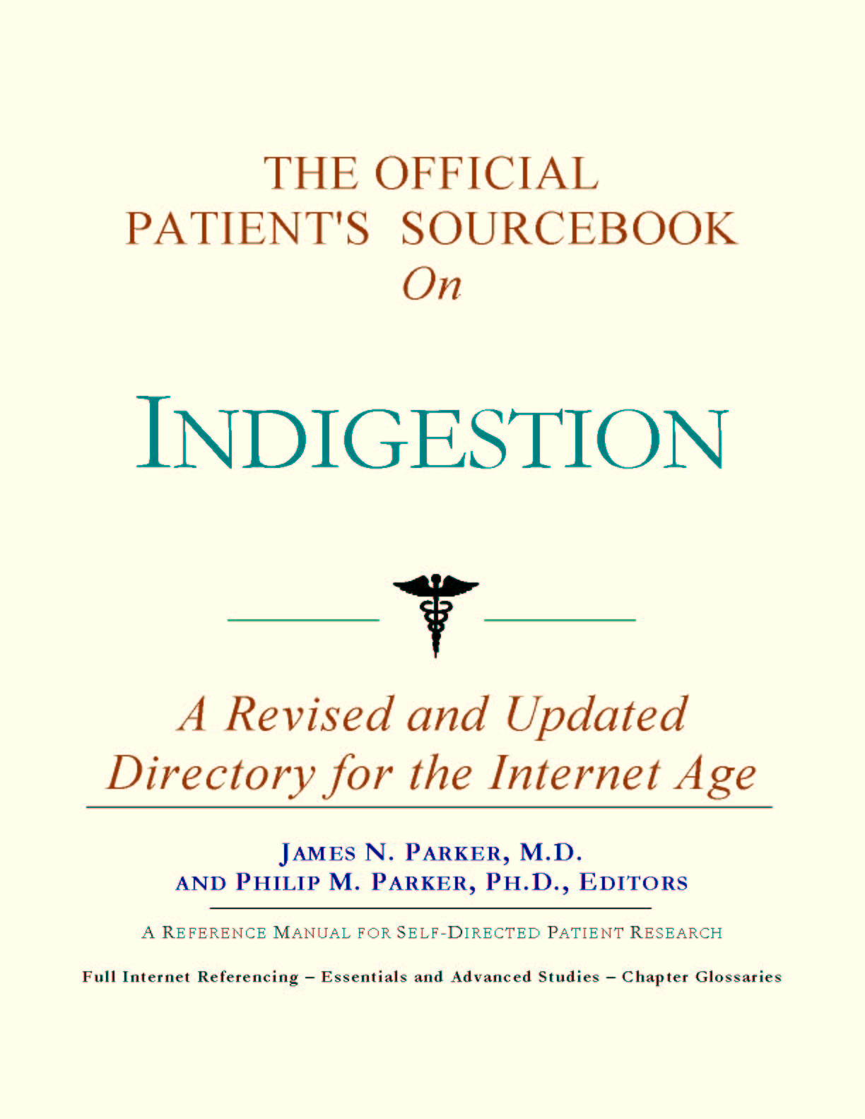 For the purposes of this sourcebook, we have attempted to be as inclusive as possible, looking for official information for all of the synonyms relevant to indigestion. You may find it useful to refer to synonyms when accessing databases or interacting with healthcare professionals and medical librarians. Moving Forward Since the 1980s, the world has seen a proliferation of healthcare guides covering most illnesses and conditions. Some are written by patients or their family members. These generally take a layperson's approach to understanding and coping with an illness or disorder. They can be uplifting, encouraging, and highly supportive. Other guides are authored by physicians or other healthcare providers who have a more clinical outlook. Each of these two styles of guide has its purpose and can be quite useful. As editors, we have chosen a third route. We have chosen to expose you to as many sources of official and peer-reviewed information as practical, for the purpose of educating you about basic and advanced knowledge as recognized by medical science today. You can think of this sourcebook as your personal Internet age reference librarian. Why “Internet age”? All too often, patients with indigestion will log on to the Internet, type words into a search engine, and receive several Web site listings which are mostly irrelevant or redundant. These patients are left to wonder where the relevant information is, and how to obtain it. Since only the smallest fraction of information dealing with indigestion is even indexed in search engines, a non-systematic approach often leads to frustration and disappointment. With this sourcebook, we hope to direct you to the information you need that you would not likely find using popular Web directories. Beyond Web listings, in many cases we will reproduce brief summaries or abstracts of available reference materials. These abstracts often contain distilled information on topics of discussion. While we focus on the more scientific aspects of indigestion, there is, of course, the emotional side to consider. Later in the sourcebook, we provide a chapter dedicated to helping you find peer groups and associations that can provide additional support beyond research produced by medical science. We hope that the choices we have made give you the most options available in moving forward. In this way, we wish you the best in your efforts to incorporate this educational approach into your treatment plan. |