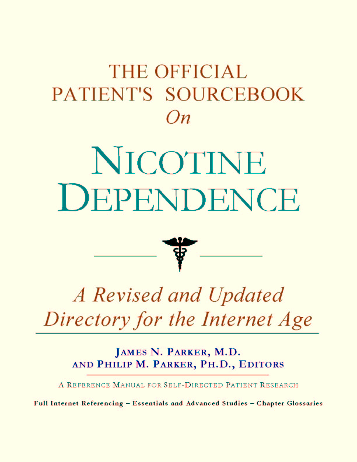 Since the late 1990s, physicians have seen a general increase in patient Internet usage rates. Patients frequently enter their doctor's offices with printed Web pages of home remedies in the guise of latest medical research. This scenario is so common that doctors often spend more time dispelling misleading information than guiding patients through sound therapies. The Official Patient’s Sourcebook on Nicotine Dependence has been created for patients who have decided to make education and research an integral part of the treatment process. The pages that follow will tell you where and how to look for information covering virtually all topics related to nicotine dependence, from the essentials to the most advanced areas of research. The title of this book includes the word “official.” This reflects the fact that the sourcebook draws from public, academic, government, and peer-reviewed research. Selected readings from various agencies are reproduced to give you some of the latest official information available to date on nicotine dependence. Given patients’ increasing sophistication in using the Internet, abundant references to reliable Internet-based resources are provided throughout this sourcebook. Where possible, guidance is provided on how to obtain free-of-charge, primary research results as well as more detailed information via the Internet. E-book and electronic versions of this sourcebook are fully interactive with each of the Internet sites mentioned (clicking on a hyperlink automatically opens your browser to the site indicated). Hard copy users of this sourcebook can type cited Web addresses directly into their browsers to obtain access to the corresponding sites. Since we are working with ICON Health Publications, hard copy Sourcebooks are frequently updated and printed on demand to ensure that the information provided is current. In addition to extensive references accessible via the Internet, every chapter presents a “Vocabulary Builder.” Many health guides offer glossaries of technical or uncommon terms in an appendix. In editing this sourcebook, we have decided to place a smaller glossary within each chapter that covers terms used in that chapter. Given the technical nature of some chapters, you may need to revisit many sections. Building one’s vocabulary of medical terms in such a gradual manner has been shown to improve the learning process. We must emphasize that no sourcebook on nicotine dependence should affirm that a specific diagnostic procedure or treatment discussed in a research study, patent, or doctoral dissertation is “correct” or your best option. This sourcebook is no exception. Each patient is unique. Deciding on appropriate options is always up to the patient in consultation with their physician and healthcare providers. Organization This sourcebook is organized into three parts. Part I explores basic techniques to researching nicotine dependence (e.g. finding guidelines on diagnosis, treatments, and prognosis), followed by a number of topics, including information on how to get in touch with organizations, associations, or other patient networks dedicated to nicotine dependence. It also gives you sources of information that can help you find a doctor in your local area specializing in treating nicotine dependence. Collectively, the material presented in Part I is a complete primer on basic research topics for patients with nicotine dependence. Part II moves on to advanced research dedicated to nicotine dependence. Part II is intended for those willing to invest many hours of hard work and study. It is here that we direct you to the latest scientific and applied research on nicotine dependence. When possible, contact names, links via the Internet, and summaries are provided. It is in Part II where the vocabulary process becomes important as authors publishing advanced research frequently use highly specialized language. In general, every attempt is made to recommend “free-to-use” options. Part III provides appendices of useful background reading for all patients with nicotine dependence or related disorders. The appendices are dedicated to more pragmatic issues faced by many patients with nicotine dependence. Accessing materials via medical libraries may be the only option for some readers, so a guide is provided for finding local medical libraries which are open to the public. Part III, therefore, focuses on advice that goes beyond the biological and scientific issues facing patients with nicotine dependence. Scope While this sourcebook covers nicotine dependence, your doctor, research publications, and specialists may refer to your condition using a variety of terms. Therefore, you should understand that nicotine dependence is often considered a synonym or a condition closely related to the following: