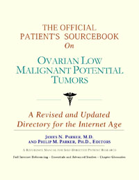 Since the late 1990s, physicians have seen a general increase in patient Internet usage rates. Patients frequently enter their doctor’s offices with printed Web pages of home remedies in the guise of latest medical research. This scenario is so common that doctors often spend more time dispelling misleading information than guiding patients through sound therapies. The Official Patient’s Sourcebook on Ovarian Low Malignant Potential Tumors has been created for patients who have decided to make education and research an integral part of the treatment process. The pages that follow will tell you where and how to look for information covering virtually all topics related to ovarian low malignant potential tumors, from the essentials to the most advanced areas of research. The title of this book includes the word “official.” This reflects the fact that the sourcebook draws from public, academic, government, and peer-reviewed research. Selected readings from various agencies are reproduced to give you some of the latest official information available to date on ovarian low malignant potential tumors. Given patients’ increasing sophistication in using the Internet, abundant references to reliable Internet-based resources are provided throughout this sourcebook. Where possible, guidance is provided on how to obtain free-of-charge, primary research results as well as more detailed information via the Internet. E-book and electronic versions of this sourcebook are fully interactive with each of the Internet sites mentioned (clicking on a hyperlink automatically opens your browser to the site indicated). Hard copy users of this sourcebook can type cited Web addresses directly into their browsers to obtain access to the corresponding sites. Since we are working with ICON Health Publications, hard copy Sourcebooks are frequently updated and printed on demand to ensure that the information provided is current. In addition to extensive references accessible via the Internet, every chapter presents a “Vocabulary Builder.” Many health guides offer glossaries of technical or uncommon terms in an appendix. In editing this sourcebook, we have decided to place a smaller glossary within each chapter that covers terms used in that chapter. Given the technical nature of some chapters, you may need to revisit many sections. Building one’s vocabulary of medical terms in such a gradual manner has been shown to improve the learning process. We must emphasize that no sourcebook on ovarian low malignant potential tumors should affirm that a specific diagnostic procedure or treatment discussed in a research study, patent, or doctoral dissertation is “correct” or your best option. This sourcebook is no exception. Each patient is unique. Deciding on appropriate options is always up to the patient in consultation with their physician and healthcare providers. Organization This sourcebook is organized into three parts. Part I explores basic techniques to researching ovarian low malignant potential tumors (e.g. finding guidelines on diagnosis, treatments, and prognosis), followed by a number of topics, including information on how to get in touch with organizations, associations, or other patient networks dedicated to ovarian low malignant potential tumors. It also gives you sources of information that can help you find a doctor in your local area specializing in treating ovarian low malignant potential tumors. Collectively, the material presented in Part I is a complete primer on basic research topics for patients with ovarian low malignant potential tumors. Part II moves on to advanced research dedicated to ovarian low malignant potential tumors. Part II is intended for those willing to invest many hours of hard work and study. It is here that we direct you to the latest scientific and applied research on ovarian low malignant potential tumors. When possible, contact names, links via the Internet, and summaries are provided. It is in Part II where the vocabulary process becomes important as authors publishing advanced research frequently use highly specialized language. In general, every attempt is made to recommend “free-to-use” options. Part III provides appendices of useful background reading for all patients with ovarian low malignant potential tumors or related disorders. The appendices are dedicated to more pragmatic issues faced by many patients with ovarian low malignant potential tumors. Accessing materials via medical libraries may be the only option for some readers, so a guide is provided for finding local medical libraries which are open to the public. Part III, therefore, focuses on advice that goes beyond the biological and scientific issues facing patients with ovarian low malignant potential tumors. Scope While this sourcebook covers ovarian low malignant potential tumors, your doctor, research publications, and specialists may refer to your condition using a variety of terms. Therefore, you should understand that ovarian low malignant potential tumors is often considered a synonym or a condition closely related to the following: