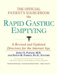 Since the late 1990s, physicians have seen a general increase in patient Internet usage rates. Patients frequently enter their doctor’s offices with printed Web pages of home remedies in the guise of latest medical research. This scenario is so common that doctors often spend more time dispelling misleading information than guiding patients through sound therapies. The Official Patient’s Sourcebook on Rapid Gastric Emptying has been created for patients who have decided to make education and research an integral part of the treatment process. The pages that follow will tell you where and how to look for information covering virtually all topics related to rapid gastric emptying, from the essentials to the most advanced areas of research. The title of this book includes the word “official.” This reflects the fact that the sourcebook draws from public, academic, government, and peer-reviewed research. Selected readings from various agencies are reproduced to give you some of the latest official information available to date on rapid gastric emptying. Given patients’ increasing sophistication in using the Internet, abundant references to reliable Internet-based resources are provided throughout this sourcebook. Where possible, guidance is provided on how to obtain free-of-charge, primary research results as well as more detailed information via the Internet. E-book and electronic versions of this sourcebook are fully interactive with each of the Internet sites mentioned (clicking on a hyperlink automatically opens your browser to the site indicated). Hard copy users of this sourcebook can type cited Web addresses directly into their browsers to obtain access to the corresponding sites. Since we are working with ICON Health Publications, hard copy Sourcebooks are frequently updated and printed on demand to ensure that the information provided is current. In addition to extensive references accessible via the Internet, every chapter presents a “Vocabulary Builder.” Many health guides offer glossaries of technical or uncommon terms in an appendix. In editing this sourcebook, we have decided to place a smaller glossary within each chapter that covers terms used in that chapter. Given the technical nature of some chapters, you may need to revisit many sections. Building one’s vocabulary of medical terms in such a gradual manner has been shown to improve the learning process. We must emphasize that no sourcebook on rapid gastric emptying should affirm that a specific diagnostic procedure or treatment discussed in a research study, patent, or doctoral dissertation is “correct” or your best option. This sourcebook is no exception. Each patient is unique. Deciding on appropriate options is always up to the patient in consultation with their physician and healthcare providers. Organization This sourcebook is organized into three parts. Part I explores basic techniques to researching rapid gastric emptying (e.g. finding guidelines on diagnosis, treatments, and prognosis), followed by a number of topics, including information on how to get in touch with organizations, associations, or other patient networks dedicated to rapid gastric emptying. It also gives you sources of information that can help you find a doctor in your local area specializing in treating rapid gastric emptying. Collectively, the material presented in Part I is a complete primer on basic research topics for patients with rapid gastric emptying. Part II moves on to advanced research dedicated to rapid gastric emptying. Part II is intended for those willing to invest many hours of hard work and study. It is here that we direct you to the latest scientific and applied research on rapid gastric emptying. When possible, contact names, links via the Internet, and summaries are provided. It is in Part II where the vocabulary process becomes important as authors publishing advanced research frequently use highly specialized language. In general, every attempt is made to recommend “free-to-use” options. Part III provides appendices of useful background reading for all patients with rapid gastric emptying or related disorders. The appendices are dedicated to more pragmatic issues faced by many patients with rapid gastric emptying. Accessing materials via medical libraries may be the only option for some readers, so a guide is provided for finding local medical libraries which are open to the public. Part III, therefore, focuses on advice that goes beyond the biological and scientific issues facing patients with rapid gastric emptying. Scope While this sourcebook covers rapid gastric emptying, your doctor, research publications, and specialists may refer to your condition using a variety of terms. Therefore, you should understand that rapid gastric emptying is often considered a synonym or a condition closely related to the following: