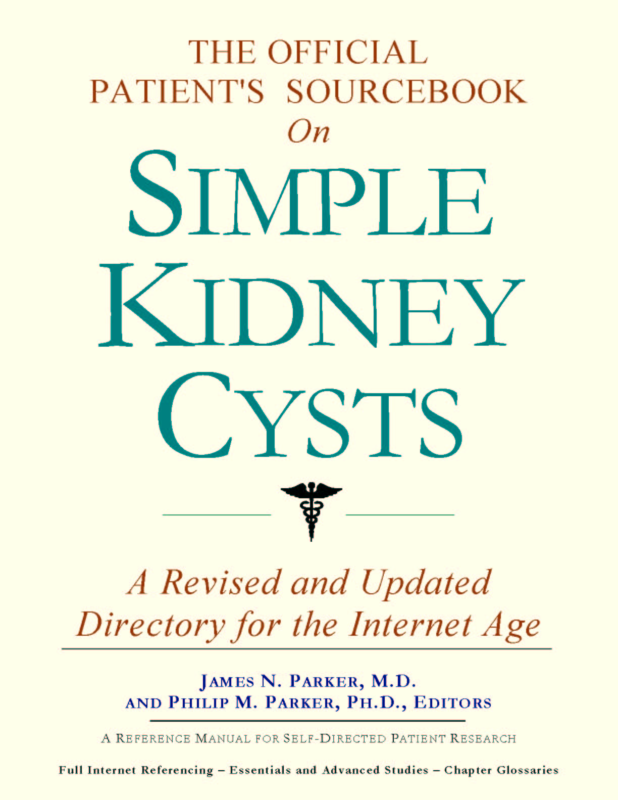 Since the late 1990s, physicians have seen a general increase in patient Internet usage rates. Patients frequently enter their doctor's offices with printed Web pages of home remedies in the guise of latest medical research. This scenario is so common that doctors often spend more time dispelling misleading information than guiding patients through sound therapies. The Official Patient’s Sourcebook on Simple Kidney Cysts has been created for patients who have decided to make education and research an integral part of the treatment process. The pages that follow will tell you where and how to look for information covering virtually all topics related to simple kidney cysts, from the essentials to the most advanced areas of research. The title of this book includes the word “official.” This reflects the fact that the sourcebook draws from public, academic, government, and peer-reviewed research. Selected readings from various agencies are reproduced to give you some of the latest official information available to date on simple kidney cysts. Given patients’ increasing sophistication in using the Internet, abundant references to reliable Internet-based resources are provided throughout this sourcebook. Where possible, guidance is provided on how to obtain free-of-charge, primary research results as well as more detailed information via the Internet. E-book and electronic versions of this sourcebook are fully interactive with each of the Internet sites mentioned (clicking on a hyperlink automatically opens your browser to the site indicated). Hard copy users of this sourcebook can type cited Web addresses directly into their browsers to obtain access to the corresponding sites. Since we are working with ICON Health Publications, hard copy Sourcebooks are frequently updated and printed on demand to ensure that the information provided is current. In addition to extensive references accessible via the Internet, every chapter presents a “Vocabulary Builder.” Many health guides offer glossaries of technical or uncommon terms in an appendix. In editing this sourcebook, we have decided to place a smaller glossary within each chapter that covers terms used in that chapter. Given the technical nature of some chapters, you may need to revisit many sections. Building one’s vocabulary of medical terms in such a gradual manner has been shown to improve the learning process. We must emphasize that no sourcebook on simple kidney cysts should affirm that a specific diagnostic procedure or treatment discussed in a research study, patent, or doctoral dissertation is “correct” or your best option. This sourcebook is no exception. Each patient is unique. Deciding on appropriate options is always up to the patient in consultation with their physician and healthcare providers. Organization This sourcebook is organized into three parts. Part I explores basic techniques to researching simple kidney cysts (e.g. finding guidelines on diagnosis, treatments, and prognosis), followed by a number of topics, including information on how to get in touch with organizations, associations, or other patient networks dedicated to simple kidney cysts. It also gives you sources of information that can help you find a doctor in your local area specializing in treating simple kidney cysts. Collectively, the material presented in Part I is a complete primer on basic research topics for patients with simple kidney cysts. Part II moves on to advanced research dedicated to simple kidney cysts. Part II is intended for those willing to invest many hours of hard work and study. It is here that we direct you to the latest scientific and applied research on simple kidney cysts. When possible, contact names, links via the Internet, and summaries are provided. It is in Part II where the vocabulary process becomes important as authors publishing advanced research frequently use highly specialized language. In general, every attempt is made to recommend “free-to-use” options. Part III provides appendices of useful background reading for all patients with simple kidney cysts or related disorders. The appendices are dedicated to more pragmatic issues faced by many patients with simple kidney cysts. Accessing materials via medical libraries may be the only option for some readers, so a guide is provided for finding local medical libraries which are open to the public. Part III, therefore, focuses on advice that goes beyond the biological and scientific issues facing patients with simple kidney cysts. Scope While this sourcebook covers simple kidney cysts, your doctor, research publications, and specialists may refer to your condition using a variety of terms. Therefore, you should understand that simple kidney cysts is often considered a synonym or a condition closely related to the following:
