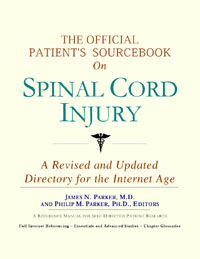 Since the late 1990s, physicians have seen a general increase in patient Internet usage rates. Patients frequently enter their doctor’s offices with printed Web pages of home remedies in the guise of latest medical research. This scenario is so common that doctors often spend more time dispelling misleading information than guiding patients through sound therapies. The Official Patient’s Sourcebook on Spinal Cord Injury has been created for patients who have decided to make education and research an integral part of the treatment process. The pages that follow will tell you where and how to look for information covering virtually all topics related to spinal cord injury, from the essentials to the most advanced areas of research. The title of this book includes the word “official.” This reflects the fact that the sourcebook draws from public, academic, government, and peer-reviewed research. Selected readings from various agencies are reproduced to give you some of the latest official information available to date on spinal cord injury. Given patients’ increasing sophistication in using the Internet, abundant references to reliable Internet-based resources are provided throughout this sourcebook. Where possible, guidance is provided on how to obtain free-of-charge, primary research results as well as more detailed information via the Internet. E-book and electronic versions of this sourcebook are fully interactive with each of the Internet sites mentioned (clicking on a hyperlink automatically opens your browser to the site indicated). Hard copy users of this sourcebook can type cited Web addresses directly into their browsers to obtain access to the corresponding sites. Since we are working with ICON Health Publications, hard copy Sourcebooks are frequently updated and printed on demand to ensure that the information provided is current. In addition to extensive references accessible via the Internet, every chapter presents a “Vocabulary Builder.” Many health guides offer glossaries of technical or uncommon terms in an appendix. In editing this sourcebook, we have decided to place a smaller glossary within each chapter that covers terms used in that chapter. Given the technical nature of some chapters, you may need to revisit many sections. Building one’s vocabulary of medical terms in such a gradual manner has been shown to improve the learning process. We must emphasize that no sourcebook on spinal cord injury should affirm that a specific diagnostic procedure or treatment discussed in a research study, patent, or doctoral dissertation is “correct” or your best option. This sourcebook is no exception. Each patient is unique. Deciding on appropriate options is always up to the patient in consultation with their physician and healthcare providers. Organization This sourcebook is organized into three parts. Part I explores basic techniques to researching spinal cord injury (e.g. finding guidelines on diagnosis, treatments, and prognosis), followed by a number of topics, including information on how to get in touch with organizations, associations, or other patient networks dedicated to spinal cord injury. It also gives you sources of information that can help you find a doctor in your local area specializing in treating spinal cord injury. Collectively, the material presented in Part I is a complete primer on basic research topics for patients with spinal cord injury. Part II moves on to advanced research dedicated to spinal cord injury. Part II is intended for those willing to invest many hours of hard work and study. It is here that we direct you to the latest scientific and applied research on spinal cord injury. When possible, contact names, links via the Internet, and summaries are provided. It is in Part II where the vocabulary process becomes important as authors publishing advanced research frequently use highly specialized language. In general, every attempt is made to recommend “free-to-use” options. Part III provides appendices of useful background reading for all patients with spinal cord injury or related disorders. The appendices are dedicated to more pragmatic issues faced by many patients with spinal cord injury. Accessing materials via medical libraries may be the only option for some readers, so a guide is provided for finding local medical libraries which are open to the public. Part III, therefore, focuses on advice that goes beyond the biological and scientific issues facing patients with spinal cord injury. Scope While this sourcebook covers spinal cord injury, your doctor, research publications, and specialists may refer to your condition using a variety of terms. Therefore, you should understand that spinal cord injury is often considered a synonym or a condition closely related to the following: