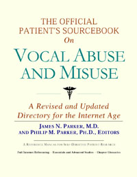 Since the late 1990s, physicians have seen a general increase in patient Internet usage rates. Patients frequently enter their doctor’s offices with printed Web pages of home remedies in the guise of latest medical research. This scenario is so common that doctors often spend more time dispelling misleading information than guiding patients through sound therapies. The Official Patient’s Sourcebook on Vocal Abuse and Misuse has been created for patients who have decided to make education and research an integral part of the treatment process. The pages that follow will tell you where and how to look for information covering virtually all topics related to vocal abuse and misuse, from the essentials to the most advanced areas of research. The title of this book includes the word “official.” This reflects the fact that the sourcebook draws from public, academic, government, and peer-reviewed research. Selected readings from various agencies are reproduced to give you some of the latest official information available to date on vocal abuse and misuse. Given patients’ increasing sophistication in using the Internet, abundant references to reliable Internet-based resources are provided throughout this sourcebook. Where possible, guidance is provided on how to obtain free-of-charge, primary research results as well as more detailed information via the Internet. E-book and electronic versions of this sourcebook are fully interactive with each of the Internet sites mentioned (clicking on a hyperlink automatically opens your browser to the site indicated). Hard copy users of this sourcebook can type cited Web addresses directly into their browsers to obtain access to the corresponding sites. Since we are working with ICON Health Publications, hard copy Sourcebooks are frequently updated and printed on demand to ensure that the information provided is current. In addition to extensive references accessible via the Internet, every chapter presents a “Vocabulary Builder.” Many health guides offer glossaries of technical or uncommon terms in an appendix. In editing this sourcebook, we have decided to place a smaller glossary within each chapter that covers terms used in that chapter. Given the technical nature of some chapters, you may need to revisit many sections. Building one’s vocabulary of medical terms in such a gradual manner has been shown to improve the learning process. We must emphasize that no sourcebook on vocal abuse and misuse should affirm that a specific diagnostic procedure or treatment discussed in a research study, patent, or doctoral dissertation is “correct” or your best option. This sourcebook is no exception. Each patient is unique. Deciding on appropriate options is always up to the patient in consultation with their physician and healthcare providers. Organization This sourcebook is organized into three parts. Part I explores basic techniques to researching vocal abuse and misuse (e.g. finding guidelines on diagnosis, treatments, and prognosis), followed by a number of topics, including information on how to get in touch with organizations, associations, or other patient networks dedicated to vocal abuse and misuse. It also gives you sources of information that can help you find a doctor in your local area specializing in treating vocal abuse and misuse. Collectively, the material presented in Part I is a complete primer on basic research topics for patients with vocal abuse and misuse. Part II moves on to advanced research dedicated to vocal abuse and misuse. Part II is intended for those willing to invest many hours of hard work and study. It is here that we direct you to the latest scientific and applied research on vocal abuse and misuse. When possible, contact names, links via the Internet, and summaries are provided. It is in Part II where the vocabulary process becomes important as authors publishing advanced research frequently use highly specialized language. In general, every attempt is made to recommend “free-to-use” options. Part III provides appendices of useful background reading for all patients with vocal abuse and misuse or related disorders. The appendices are dedicated to more pragmatic issues faced by many patients with vocal abuse and misuse. Accessing materials via medical libraries may be the only option for some readers, so a guide is provided for finding local medical libraries which are open to the public. Part III, therefore, focuses on advice that goes beyond the biological and scientific issues facing patients with vocal abuse and misuse. Scope While this sourcebook covers vocal abuse and misuse, your doctor, research publications, and specialists may refer to your condition using a variety of terms. Therefore, you should understand that vocal abuse and misuse is often considered a synonym or a condition closely related to the following: